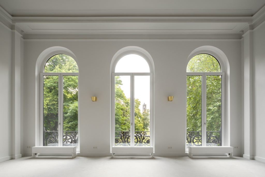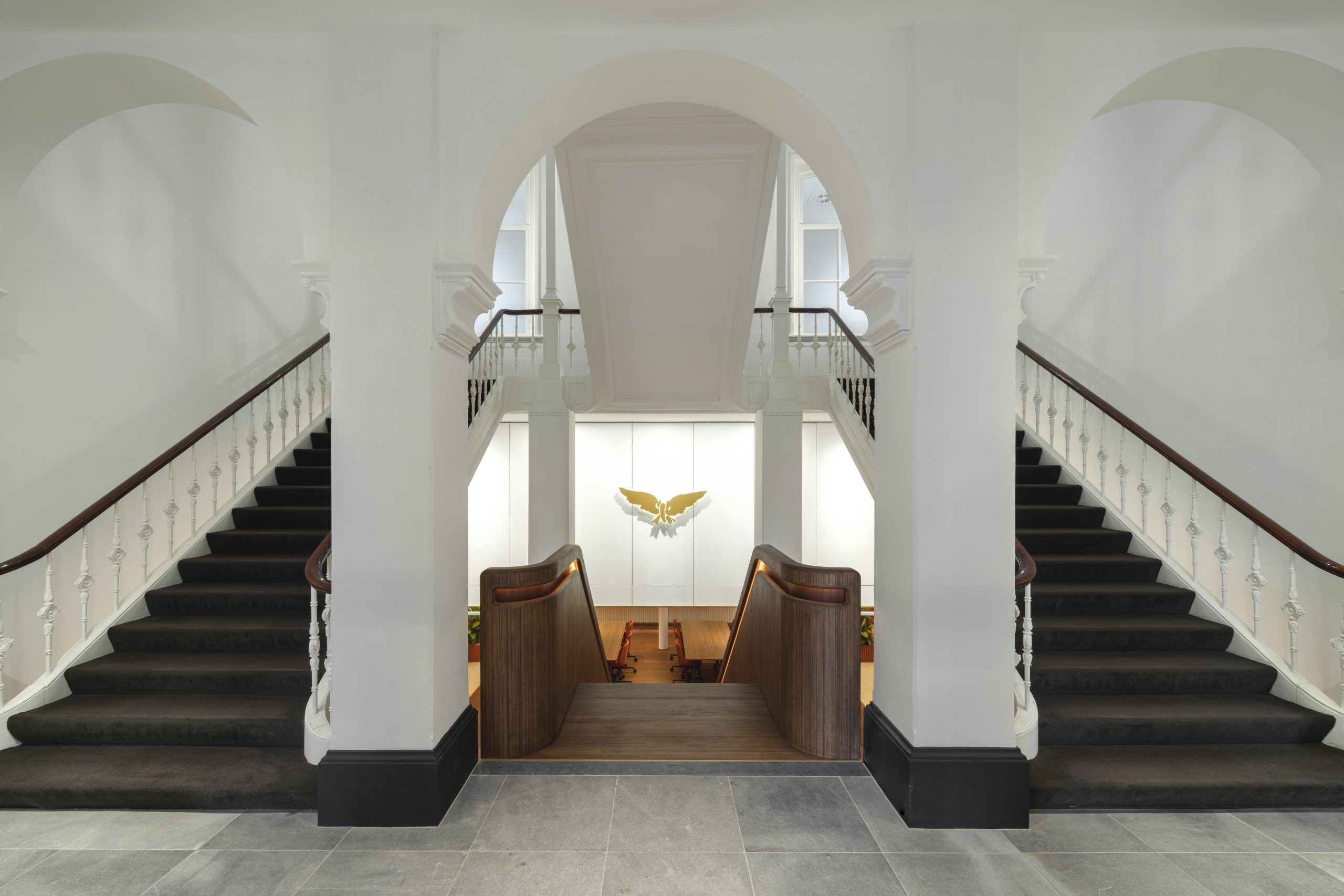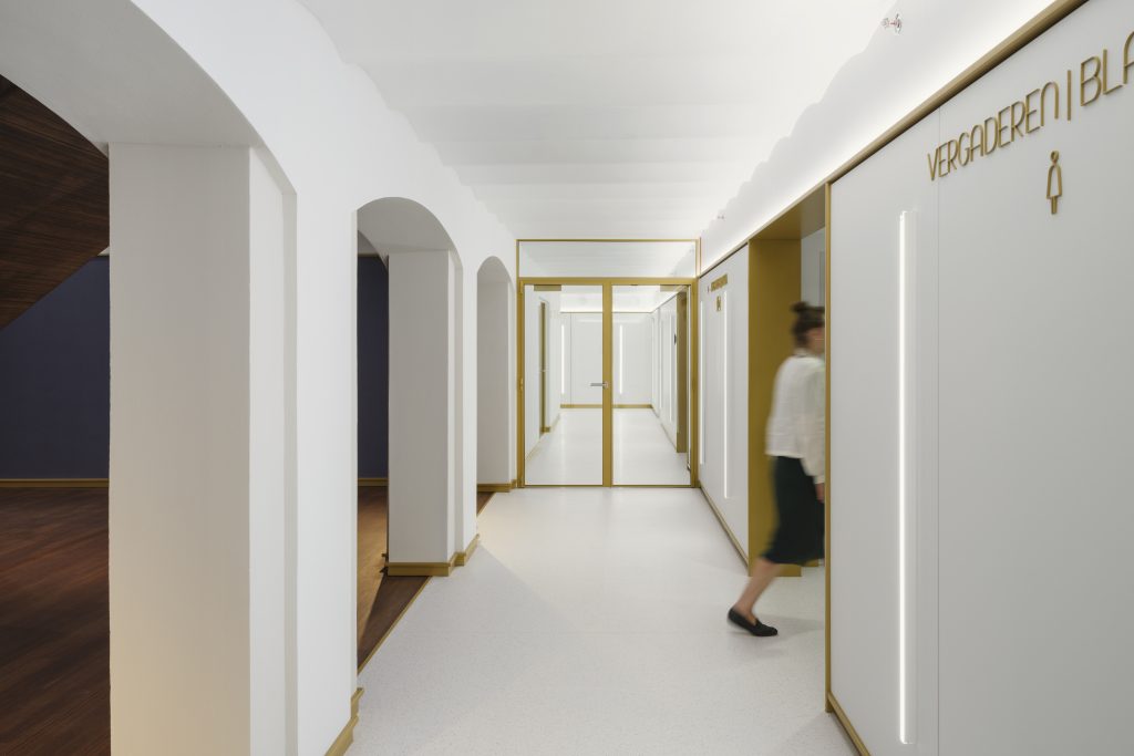 Ook het interieur ademt vakmanschap: een nieuwe bamboetrap vormt een eigentijdse toevoeging die de monumentale trappen verbindt met het souterrain. Daar zijn drie vides gerealiseerd die daglicht diep de voormalige kelder in brengen, waar nu vergaderruimtes, loungezones en een koffie- en lunchbar te vinden zijn.