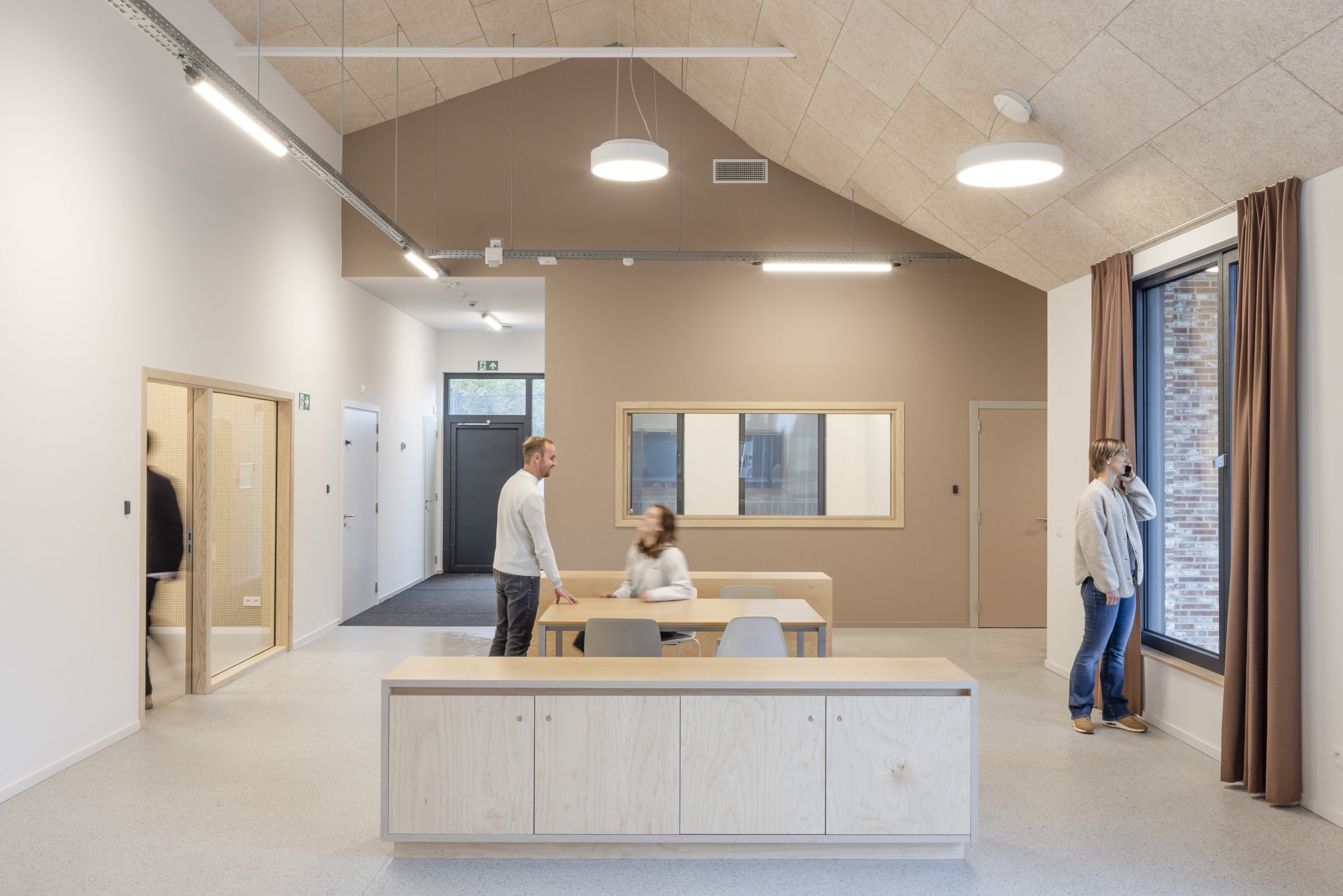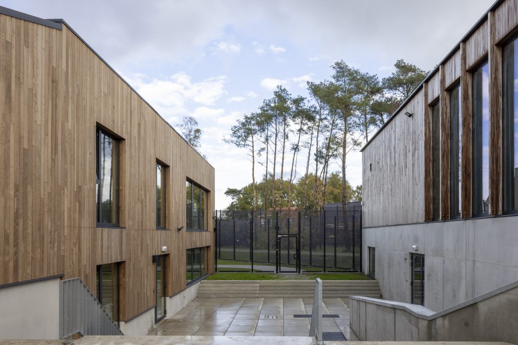 Beide gebouwen zijn direct bereikbaar vanaf het centrale plein en liggen bewust lager om de kleinschaligheid van de campus te respecteren. De woongebouwen worden afgewerkt met rode baksteen, terwijl de sport- en onderwijsgebouwen houten geveldelen hebben. Zo ontstaat onderscheid binnen het ensemble en wordt duurzaam, natuurlijk materiaal toegevoegd.