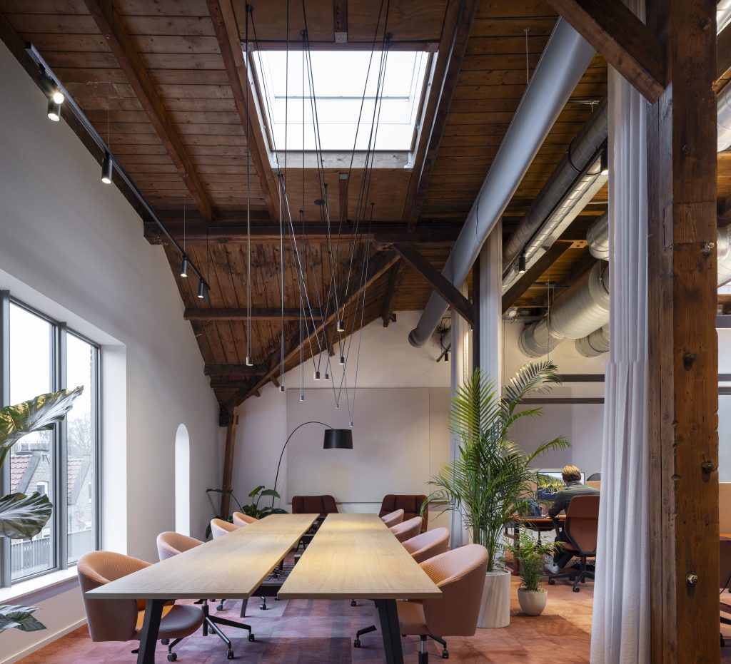 De vergaderzalen, inclusief de ruimte in de nok van de voormalige dienstwoning, plus het leslokaal van GAIn, het AI-opleidingsinstituut van Rewire, hebben hetzelfde kleurenschema en materiaalgebruik als de rest van het interieur. Overal is er veel ruimte voor beplanting. Boonstra: “Het budget hiervoor was heel royaal. Dit geldt ook voor verschillende ingrepen, zoals het vervangen van oude, verrotte houtdelen in het dak door nieuw hout, gebeitst in de originele kleur. Dit zorgt voor rust en eenvoud in de uitstraling. We hebben echt alle ruimte gekregen om deze uitgebreide laag van het interieur aan te brengen als ruimtelijke ingreep.”