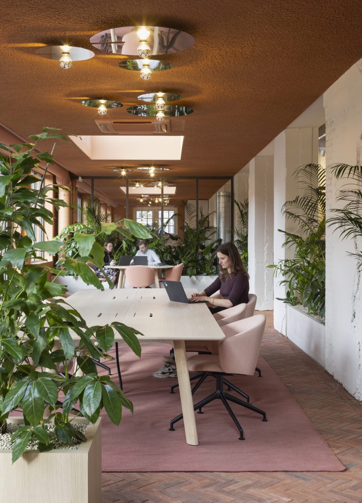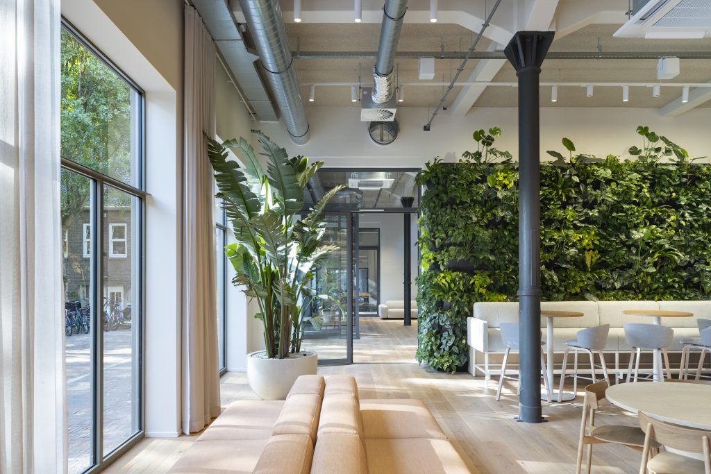 Er is gekozen voor meubelen van Arco, Vitra en werkplekken van Occony met een tijdloze, duurzame uitstraling. Boonstra: “Dit geldt ook voor de toegepaste materialen. De bakstenen vloer aan de parkzijde beneden is bijvoorbeeld gemaakt van gerecyclede bakstenen, er liggen echte eiken vloeren en geen pvc. Er is veel hout, metaal en pleisterwerk behouden en Rewire voelde meteen aan dat dit goed paste bij wat zij zochten.”