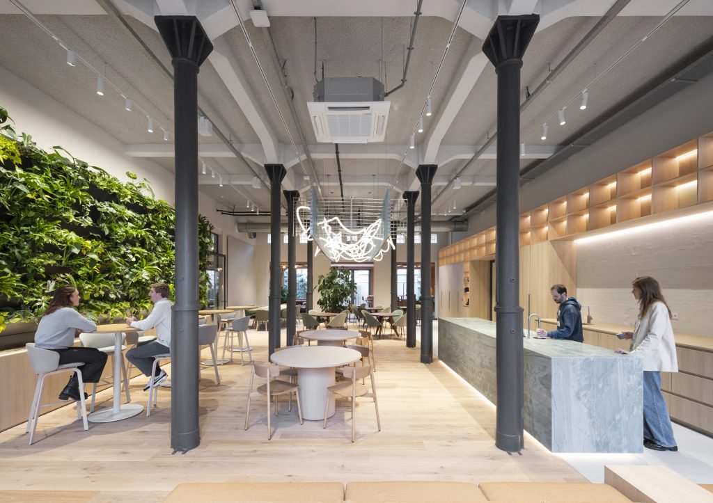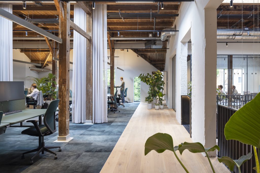 Het vinden van een balans tussen een ruwe en een verfijnde uitstraling is niet alleen zichtbaar in de eiken vloeren in een rustieke en levendige kwaliteit, en de bakstenen vloer beneden aan de parkzijde, maar ook in de tapijttegels op de werkplekken, die natuursteen optisch benaderen. Boonstra: “Het interieur is aan de ene kant ongepolijst en natuurlijk, aan de andere kant juist luxueus en comfortabel. We hebben elk meubel uitgekozen op de zintuigelijke ervaring die de gebruiker ermee heeft. Of het nu de comfortabele sofa in het keukengedeelte is, de custom made bar-bank voor de groenwand of de fauteuils van Vitra.”