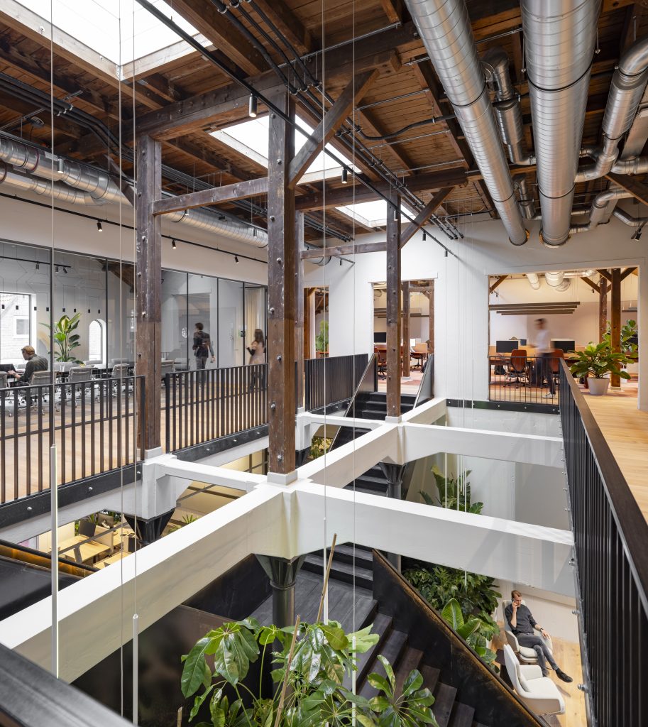 Een hypermodern bedrijf dat bewust voor een historisch pand kiest en ook nog eens blij is met het in stand houden van vele historische, zichtbare bouwdetails: “De directie van Rewire was echt op zoek naar een plek met wortels”, zegt Anne Boonstra, oprichter van up architecture. “Het kantoor moest ook een solide thuisgevoel geven aan een groep van jonge, hoogopgeleide, internationale medewerkers.” De drie voormalige stallen met hooizolder en dienstwoning van de voormalige brouwerij, werden door het team van up architecture veranderd in een flexibele verzameling werkplekken met diverse gradaties van concentratie, met elkaar verbonden door een indrukwekkende stalen trap direct achter de entree en door fraai uitgevoerde zichtlijnen in alle richtingen van het interieur.