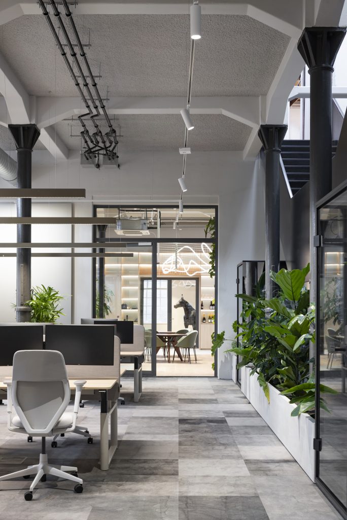De Amstel brouwerij nam na de opkomst van het gemotoriseerde verkeer relatief snel afscheid van de paarden die het bier door de stad vervoerden. Een drukkerij nam daarna zijn intrek in het pand, nu is Rewire de huurder. In het pand is de oorspronkelijke functie hier en daar nog herkenbaar”, vertelt Boonstra. “Het exterieur was aan de voorzijde aangepast door architectenbureau Cruz Y Ortiz. Wij hebben in aanvulling daarop de entree naar het midden verplaatst. Er is een vide aangebracht en vanaf het begin wilden we veel zichtlijnen creëren, die overzicht en eenheid brengen in het interieur.”