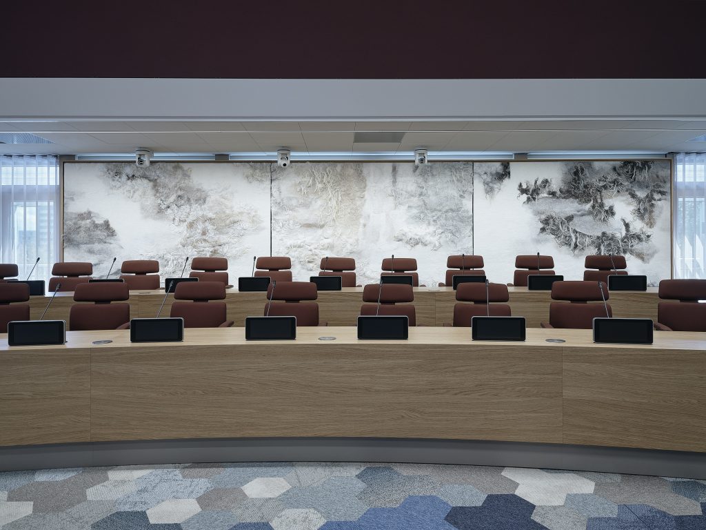 Als je vanuit de bestuursvleugel de nieuwe raadzaal inkijkt zie je als echte eyecatcher in de ruimte een wolkunstwerk van 8 meter breed en 2,30 meter hoog, gemaakt door wolkunstenares Beatrice Waanders. Hiervoor is gebruikgemaakt van het lokale wol van de kudde uit de schaapskooi van Bargerveen, nabij Emmen. Om de raadzaal te onderscheiden van de bestuursvleugel is verder verlichting toegepast in een warmere lichtkleur. Overtoom: “Dankzij de vorm, het kleurgebruik, de materialen en het licht is het een hele warme en omarmende ruimte geworden, waar de gebruikers zich mee identificeren. Dat is iets waar we heel trots op zijn.”