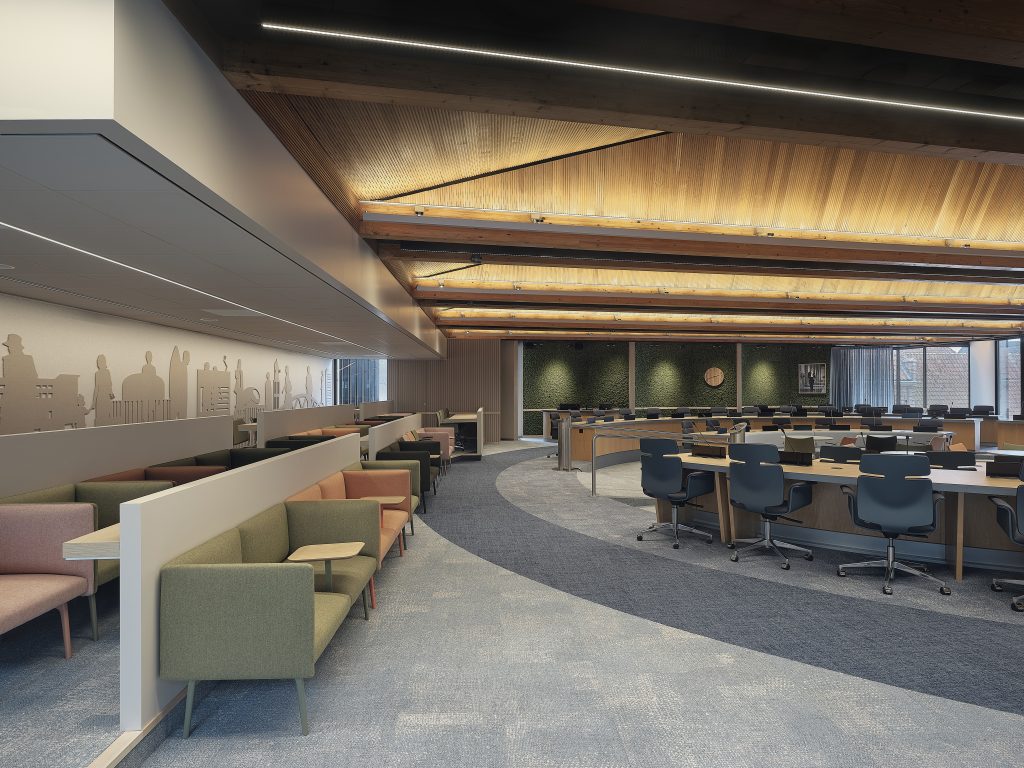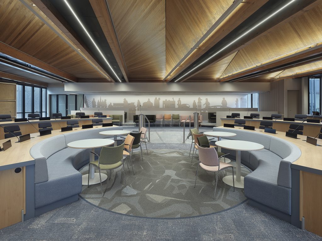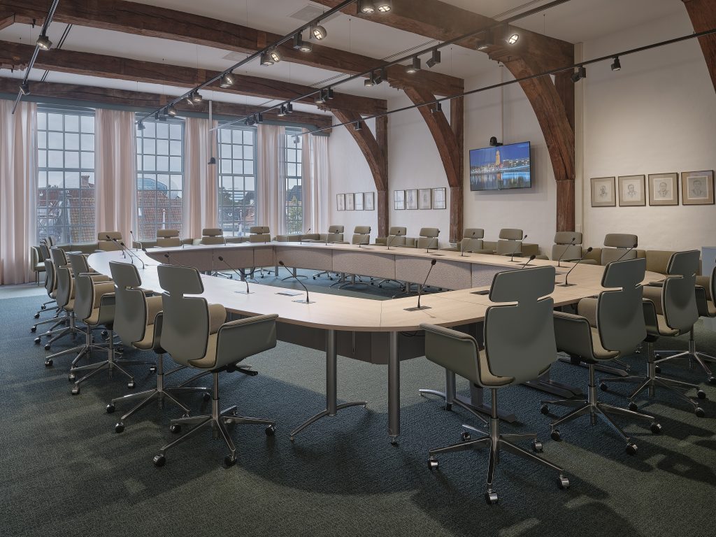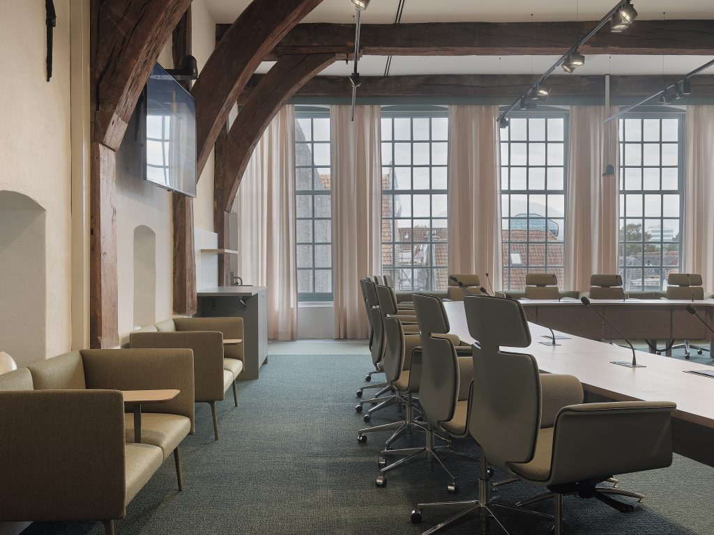 In 2018 heeft OdV interieurarchitecten samen met De architecten van Team 4 het nieuwe interieur van het stadhuis van de Gemeente Zwolle ontworpen, met uitzondering van de raad- en de Thomas a Kempis (TaK)-zaal. Vorig jaar waren ook deze twee ruimtes aan de beurt en werd de aanbesteding gewonnen door OdV interieurarchitecten. Overtoom vertelt: “Daar waren we heel blij om, want het is voor ons de voltooiing van het project uit 2018.”