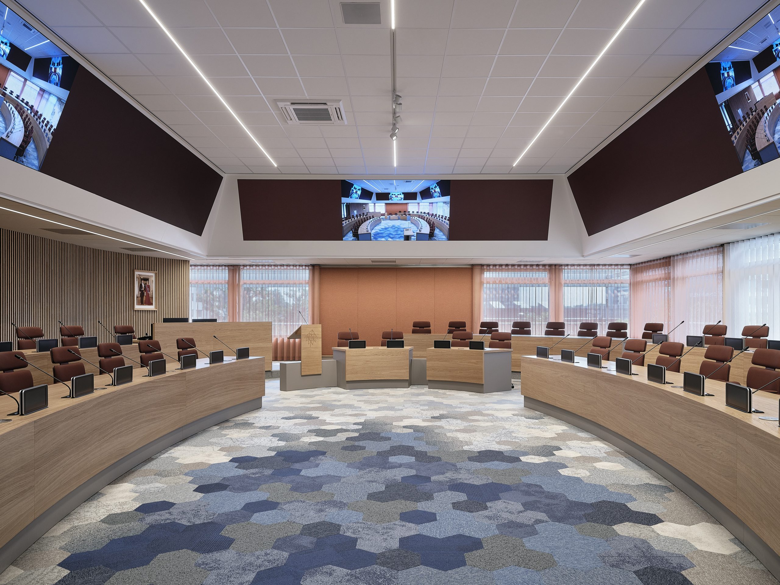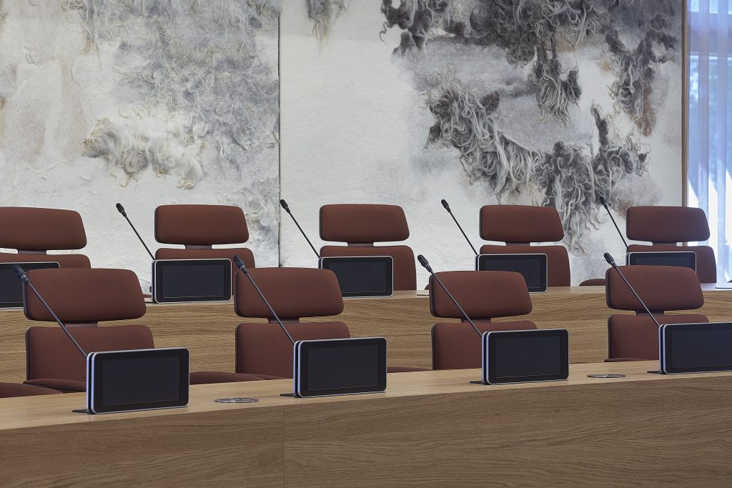 De raadzaal van de gemeente Emmen was na heel wat jaren toe aan een modernisering en herinrichting. De stuurgroep van de gemeente stelde hiervoor een programma van eisen op. OdV interieurarchitecten maakte vervolgens een interieurconcept dat hierbij aansloot. Directeur Ton Overtoom vertelt: “In dit programma van eisen is onder andere opgenomen in welke vorm de raad graag zou willen zitten. In de oude opstelling zat de gemeenteraad namelijk tegenover het college van B&W, maar dat is al jaren niet gebruikelijk meer. De gemeenteraad stelde een hoefijzer-vorm voor, met een voorste en een achterste rij op twee niveaus, waardoor de raadsleden elkaar goed kunnen zien als ze in gesprek zijn. Op de kopse kant zit de voorzitter centraal in de ruimte, geflankeerd door de griffier en twee plekken voor genodigden. Bijvoorbeeld voor leden uit het college van B&W, die tijdens raadsvergaderingen een plek op de verder naar achteren gelegen rij zonder microfoons hebben, waardoor ze niet actief kunnen deelnemen aan de vergadering. Tegenover de opening van de hoefijzer-vorm hebben we de publiekstribune gecreëerd, waardoor het publiek de opening aanvult en daarmee echt is aangesloten bij het debat”, legt Overtoom uit.