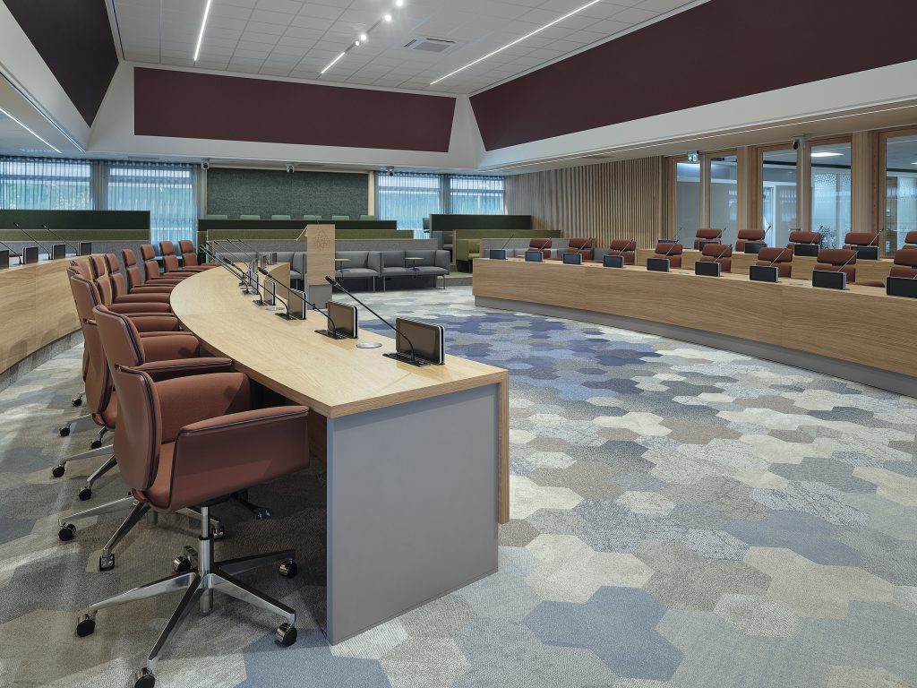 Ook de kleur blauw komt terug in het interieurconcept van OdV interieurarchitecten. “Deze kleur vormt het hart van de raadzaal. In het midden hebben we namelijk een circulair tapijt van Studio Wae neergelegd en dat is uitgevoerd in grijs- en blauwtinten. Dit tapijt is de verbeelding van een vuursteen. Een steen die staat voor de oeroude historie van Emmen, maar ook voor het vuur van het debat dat plaatsvindt in de raadzaal.”