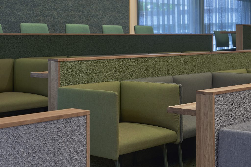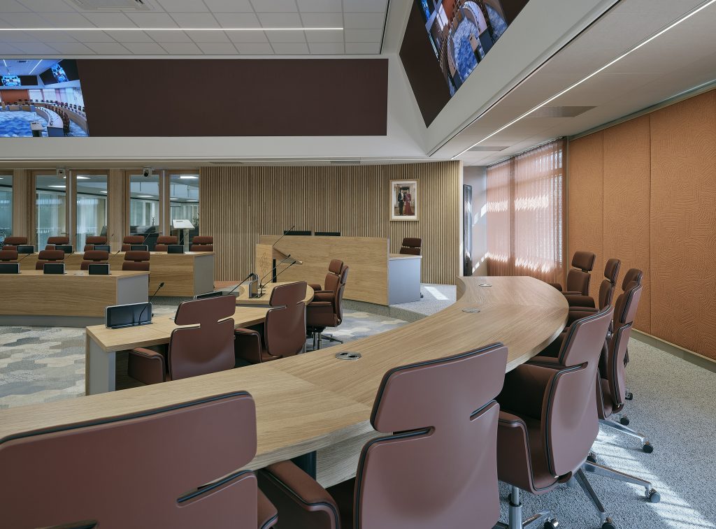 Naast de raadzaal heeft OdV interieurarchitecten ook de bestuursvleugel in het gebouw ontworpen. Overtoom: “In het nieuwe ontwerp zijn de bestuursvleugel en de raadzaal meer met elkaar verbonden. De dichte wand, die zich tussen de twee dubbele toegangsdeuren naar de raadzaal bevond, is verwijderd en heeft plaatsgemaakt voor twee extra dubbele deuren van glas. Hiermee hebben we meer transparantie gecreëerd.” De nieuwe puien zijn gemaakt van duurzaam bamboehout, evenals de lattenafwerking