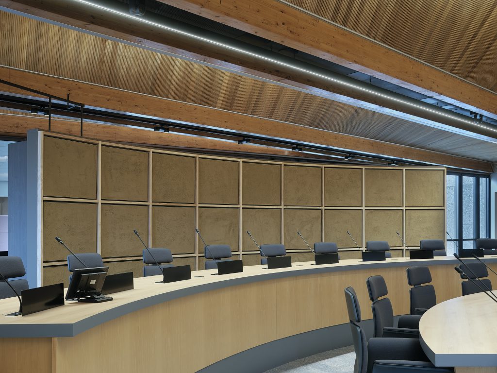 De technische ruimtes in de raadzaal hebben plaats gemaakt voor de publiekstribune, waar op de achterwand een reliëf gemaakt is van PET-felt van de stad en haar inwoners. Zo worden bestuur en burgers ook in de raadzaal weer met elkaar verbonden. De natuurlijke uitstraling van de raadzaal wordt versterkt door de toegepaste groene moswanden en de halfronde wand van het servicemeubel, die aan de kant van de raadsopstelling is afgewerkt met klimaatregulerend leemstuc.