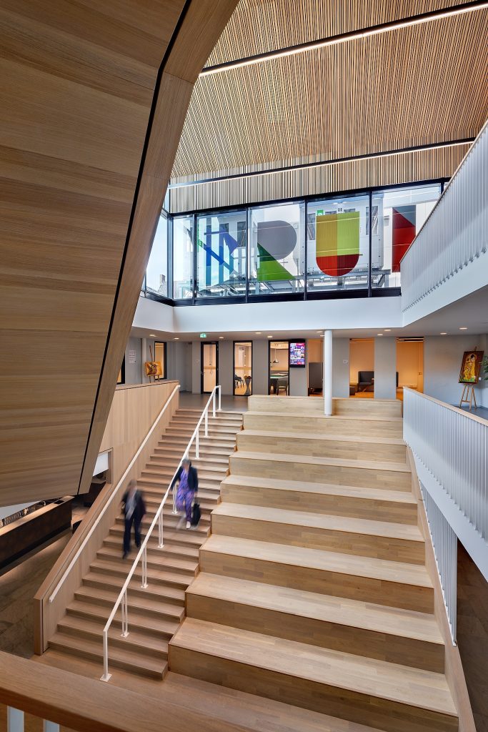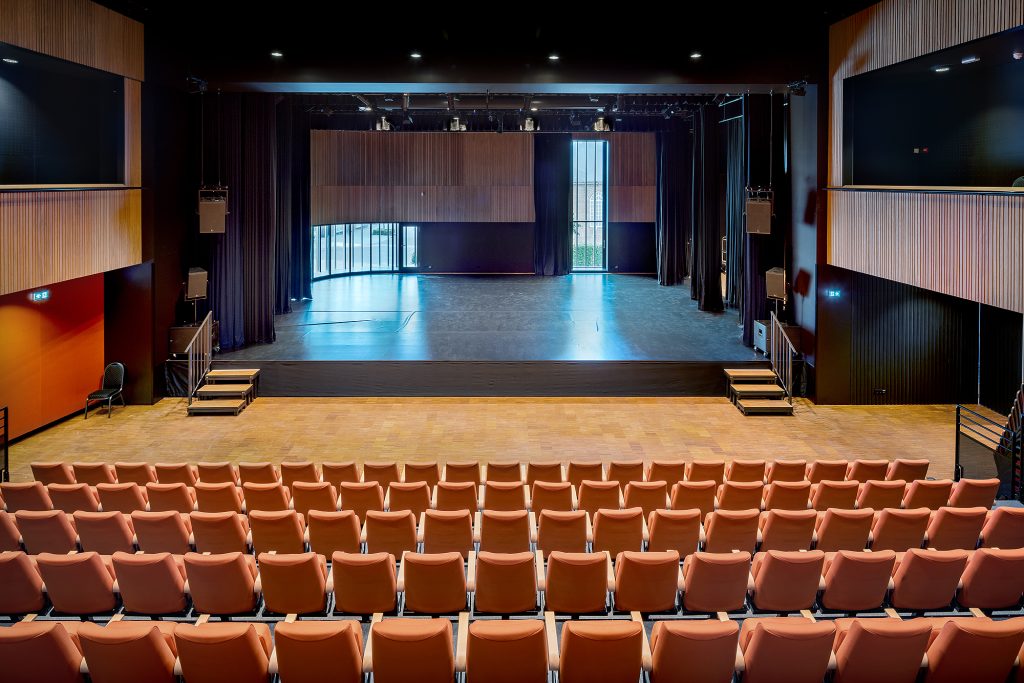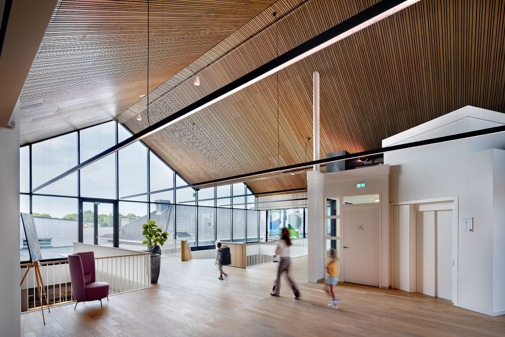 Ook de akoestische maatregelen dragen bij aan een prettige sfeer. Van Bremen: “Voor het creëren van een goede akoestiek zijn de wanden van de theaterzaal en het plafond van het atrium bekleed met akoestisch absorptiemateriaal en PET-vilt, afgewerkt met houten latten. Daarnaast hebben we veel spuitpleister op plafonds toegepast in zwart of wit, je wilt gebruikers keus bieden in de sfeer van de zalen.” Het kleurgebruik in het gebouw is neutraal en rustig gehouden, en geeft zo de gebruikers alle ruimte om zelf hun stempel op het interieur te drukken.