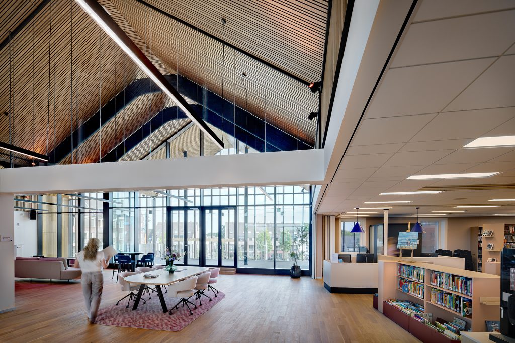 GROUP A behield grotendeels de bestaande structuur van het bankgebouw, en kon zodoende het materiaalverbruik en de CO2-uitstoot flink beperken. Materialen uit gesloopte delen zijn opnieuw gebruikt, en het gebouw is verduurzaamd met lucht/water warmtepompen, regenwateropslag en hoogwaardige isolatie. Van Bremen: “We hebben erg gelet op hergebruik. Het is een voormalige Rabobank uit 2002 dus nog een jong gebouw, voor driekwart onderkelderd. We hebben niet alleen de betonconstructie hergebruikt, maar ook veel installaties zoals de inductie units. Samen met ABT hebben we hiervoor de hele puzzel gemaakt.” Gepuzzeld is er ook, om het volledige programma in te passen in het gebouw: “Omdat er eigenlijk niet genoeg ruimte was voor de nieuwe Grote Zaal, hebben we hier een paar oplossingen voor bedacht. We hebben een flexibel podium gebouwd, er is een uitschuiftribune en het balkon hangt deels over de oudbouw, een technisch huzarenstukje van ABT. Ook is de rooilijn van de zaal iets naar buiten geschoven.” In de nieuwe zaal kunnen uiteenlopende culturele en maatschappelijke activiteiten plaatsvinden, van theater en dans tot workshops, diners en bijeenkomsten. Om plaats te bieden aan voorzieningen als toiletten en garderobe, is er onder deze zaal een extra kelder gemaakt, gekoppeld aan de bestaande kelder. Zodoende ontstaat er in het hart van het gebouw ruimte voor lucht, licht en beweging. Hier leiden vanuit het atrium grote houten trappen naar de bibliotheek en de panoramazaal aan de voorzijde van het gebouw. Voor deze trappen is eikenhout toegepast, als tegenhanger van het kale, ruwe beton van de atriumwanden. Een mooi contrast.