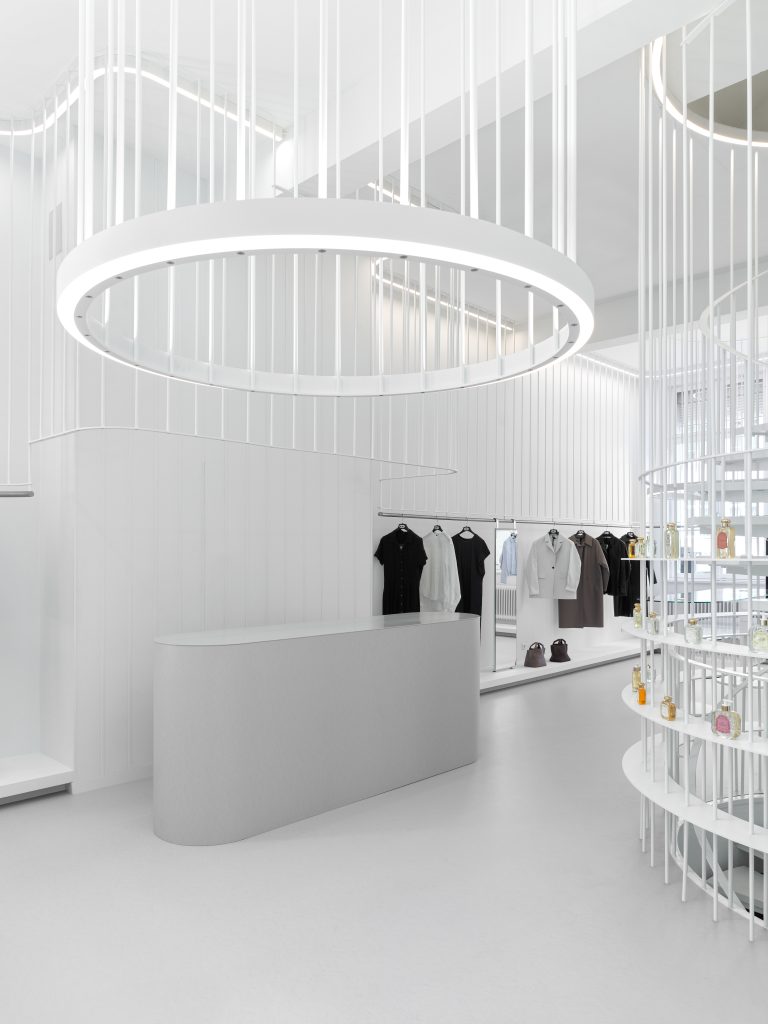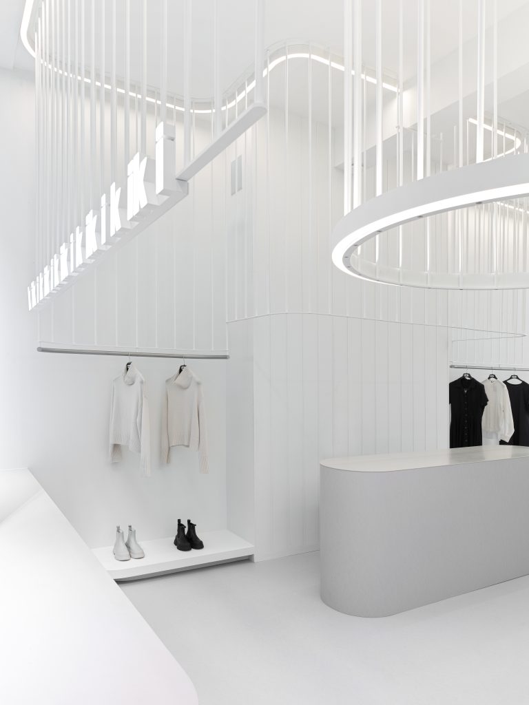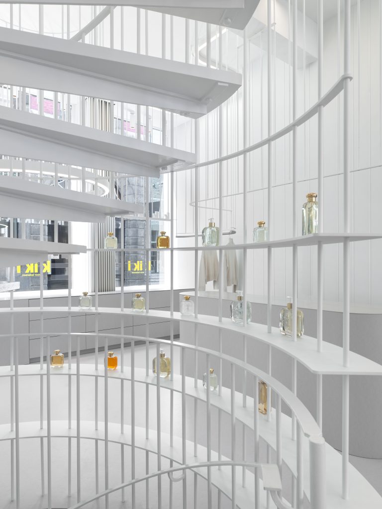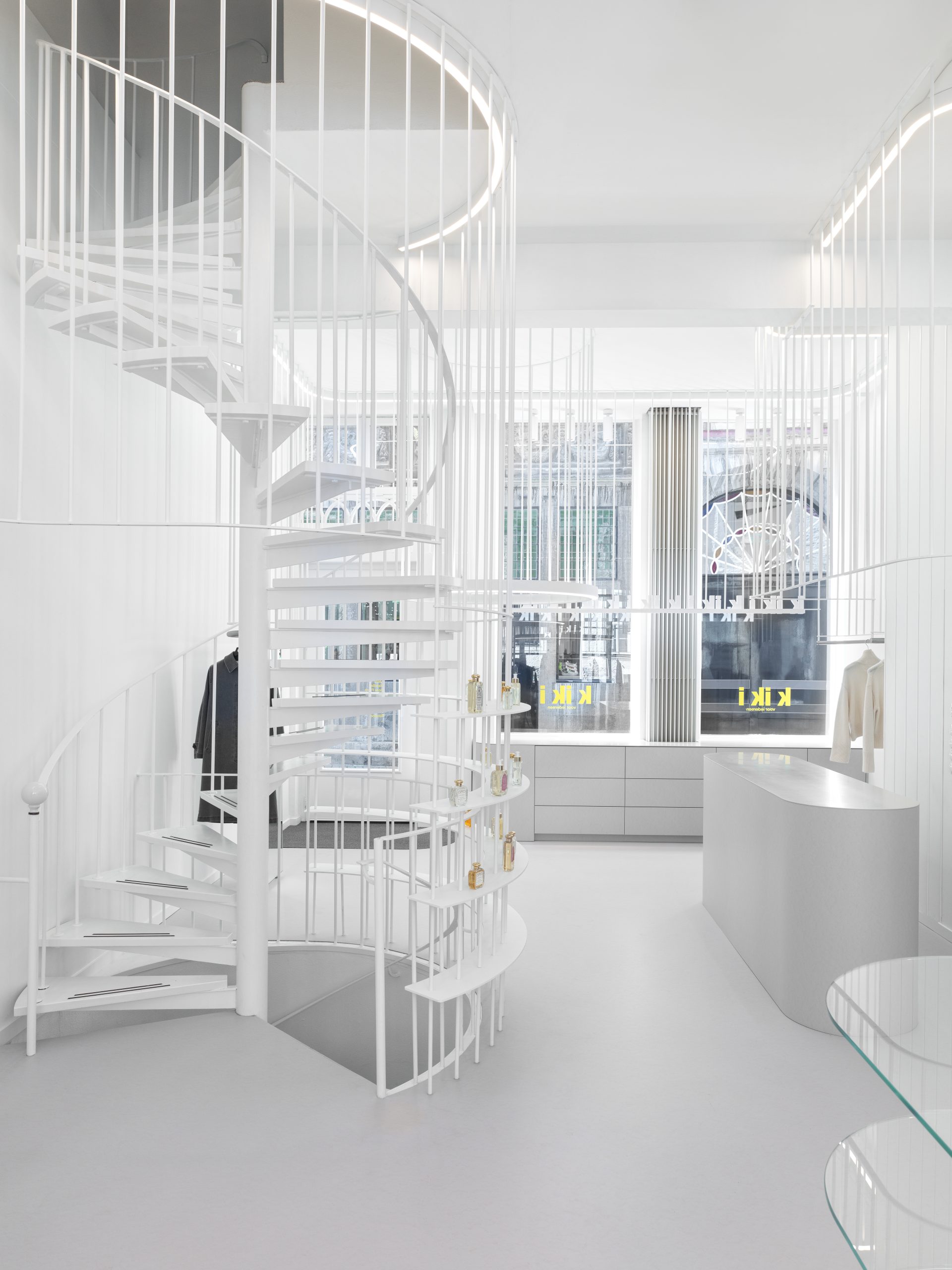 Maurice Mentjens ontwierp voor k ik i voor iedereen, de nieuwe winkel van Kiki Niesten, een vrijwel volledig wit interieur met vloeiende ronde vormen, waarbij de spijlen van een sculpturale trap een belangrijke bron van inspiratie vormden.