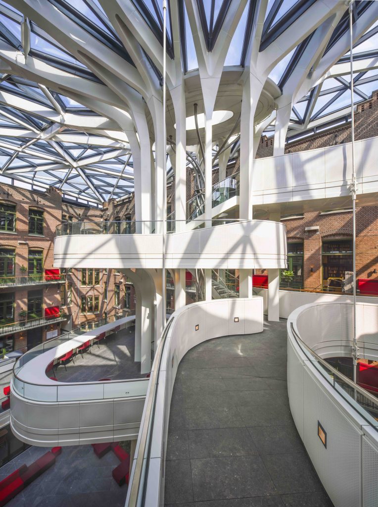 Om oud en nieuw met elkaar te verbinden, is de voormalige binnenplaats tussen de gebouwen naar ontwerp van MVSA overkapt en getransformeerd tot een atrium waar je even stil van wordt, zo mooi. Ana Carmen Gutiérrez Narvarte, architect bij MVSA: “We zochten naar een groot element dat de gebouwen kon verbinden, zonder daarbij de historische gevels aan te tasten. We hebben gekozen voor deze boomvorm, omdat die verwijst naar groei en kennis.” De staalconstructie van de overkapping heeft een structuur geïnspireerd door de nerven van een blad, met in het midden een sculpturale trap, de ‘Tree of Knowledge’. Deze is ook toegankelijk voor rolstoelgebruikers, en leidt van het drukke atrium naar de rustiger studieruimtes op de bovengelegen verdiepingen. Het atrium vormt het hart van de bibliotheek en fungeert tegelijkertijd als een klimaatbuffer, waarbij de glazen overkapping zorgt isolatie en voor regenwateropvang en -afvoer.