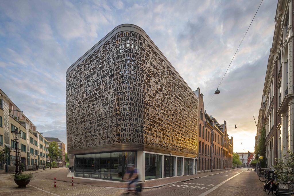 De nieuwbouw wordt omhuld door een prachtig 3D geprint gevelscherm met brons afwerking. Gutiérrez Narvarte: “Bij het ontwerp hiervan hebben we studenten en medewerkers van de universiteit via een wedstrijd gevraagd om ideeën, die moesten verwijzen naar zowel de functie van de bibliotheek als de diversiteit van Amsterdam.” Het resultaat is een patroon waarin je al snel woorden onderscheidt: ‘Lees maar, er staat niet wat er staat!’. Het is een regel uit het gedicht ‘Awater’ van Martinus Nijhoff, vertaald in alle 24 talen die je aan de UvA kunt studeren. Het scherm vormt een duidelijke verrijking voor het straatbeeld, de glazen overkapping van het atrium kun je zien als je vanuit de richting van de Staalstraat komt.