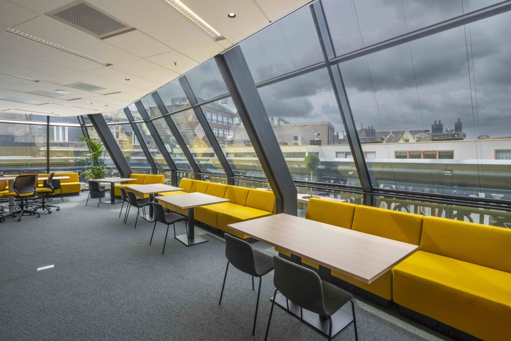 Een tweede nieuwe toevoeging bevindt zich op de hoek van de Doelenstraat, tegenover Hotel de l’Europe. In dit nieuwe bouwdeel bevindt zich op de begane grond het studentencafé, toegankelijk vanuit het atrium en vanuit de voormalige kliniek. Het is een ruimte met veel daglicht en mooi zicht op de straat, een mix van hoog en laag meubilair zorgt voor een diversiteit aan zitmogelijkheden. Op de hogere verdiepingen van dit nieuwe bouwdeel kun je letterlijk ‘tussen de boeken’ studeren, en op het dak vind je een terras en een multifunctionele ruimte voor groepen.