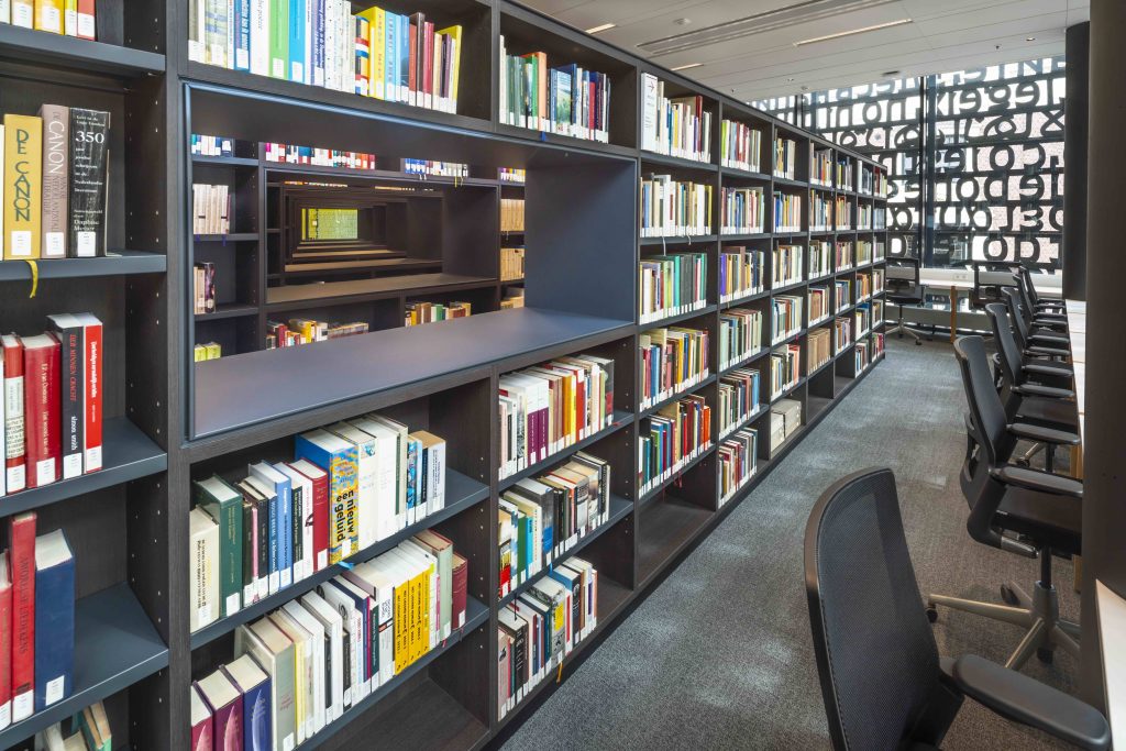 Kunst en cultuur maken vanzelfsprekend onderdeel uit van het interieur. Zo staat er in het atrium een vitrine met daarin restanten van middeleeuws aardewerk, gevonden tijdens de graafwerkzaamheden voor de kelder. Gutiérrez Narvarte: “Om plaats te maken voor de boekenuitleen en het boekendepot is de hele kelder uitgediept. Het was indrukwekkend om te zien hoe enorme balken deze gebouwen omhooghielden tijdens de werkzaamheden.” Op een andere manier indrukwekkend was het om terug te keren toen de bibliotheek eenmaal in gebruik was genomen door de universiteit: “Ik vond het heel mooi om te zien dat het gebouw, waar we zo intensief aan hebben gewerkt nu echt vol zit met studenten.”